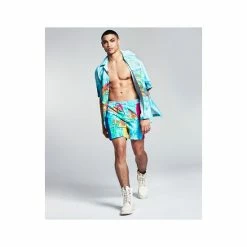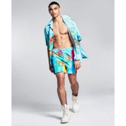 Brighten your next day at the beach or pool with the vibrant tropical-print pattern featured on these colorblocked swim trunks from And Now This.
