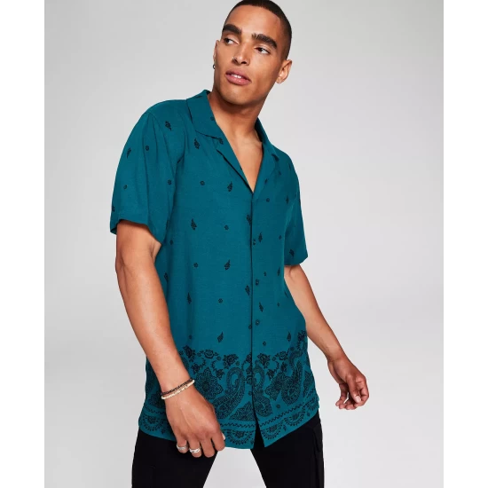 Keep your look cool for warmer weather with the comfortable camp collar and stylish bandana-print pattern of this breezy shirt from And Now This.