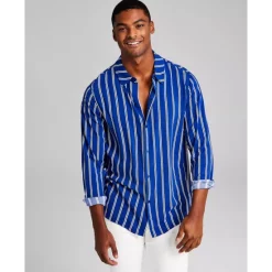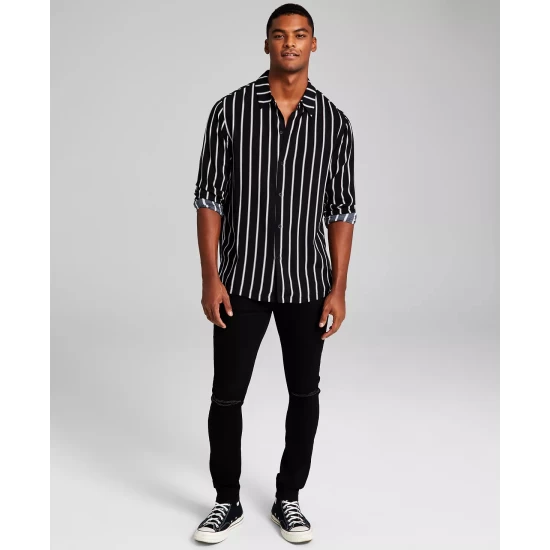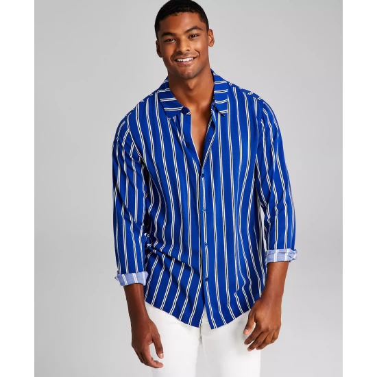 Soft fabric and a striped body set the stage for smart, evening-ready style on this long-sleeve resort shirt by And Now This.