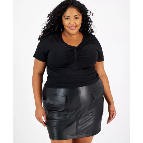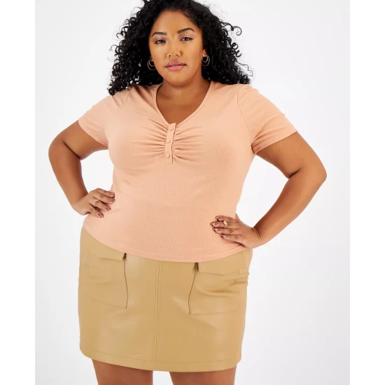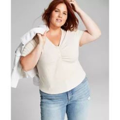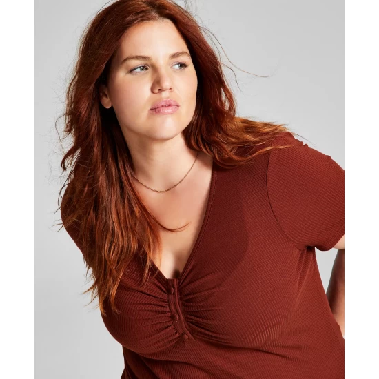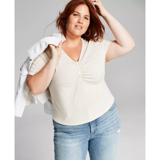 Not your typical tee, this updated style from And Now This features a ruched front, delicate buttons and body-hugging fit.