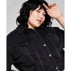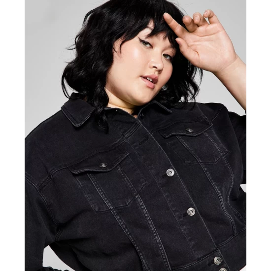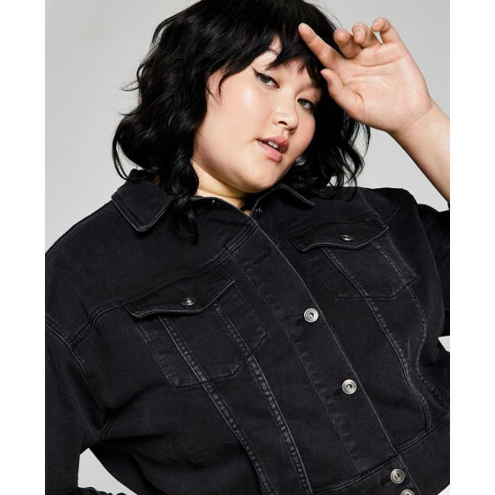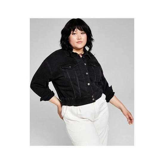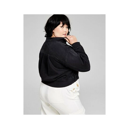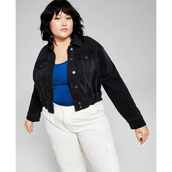 A fresh spin on denim, this plus size jacket from And Now This features a cropped silhouette and ruched elastic hem.
