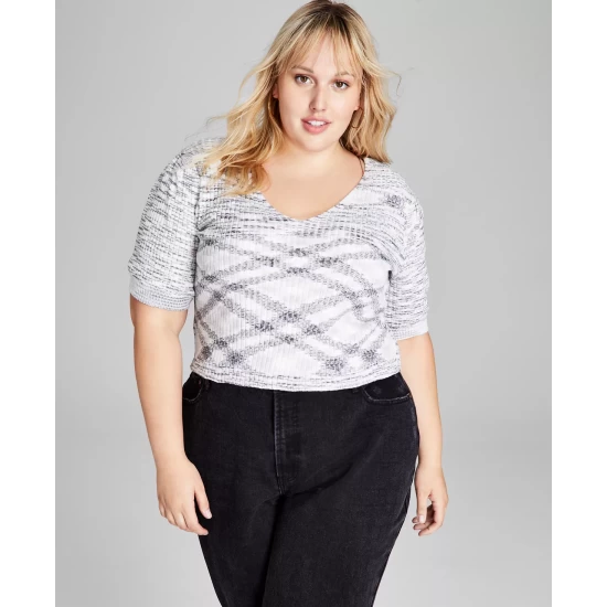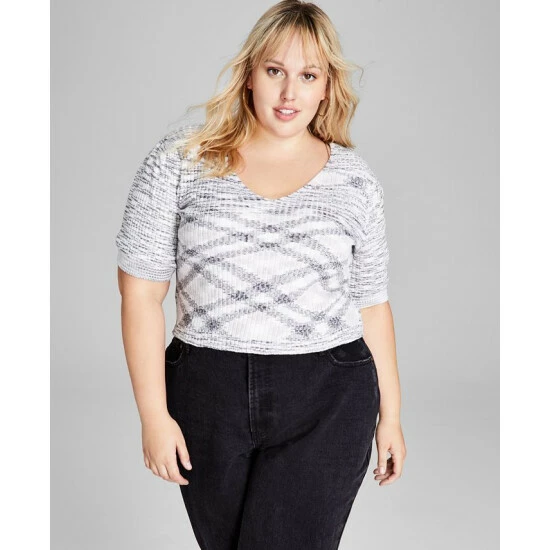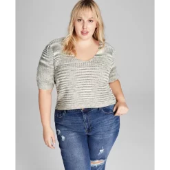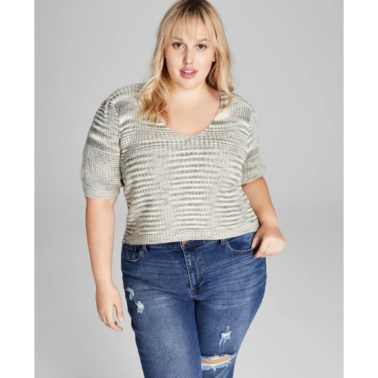 An eye-catching space dye ribbed knit amps up the textural interest in this plus size top from And Now This, a V-neck design framed by short puff sleeves for a playful touch.