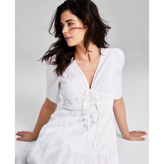 - Ties at waist; tiered at skirt